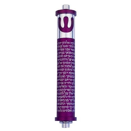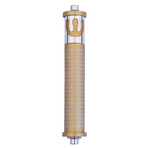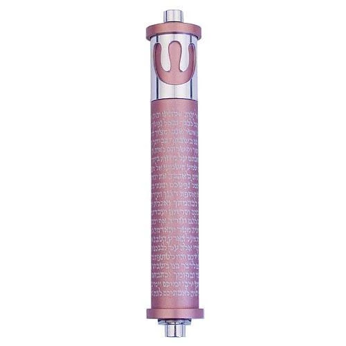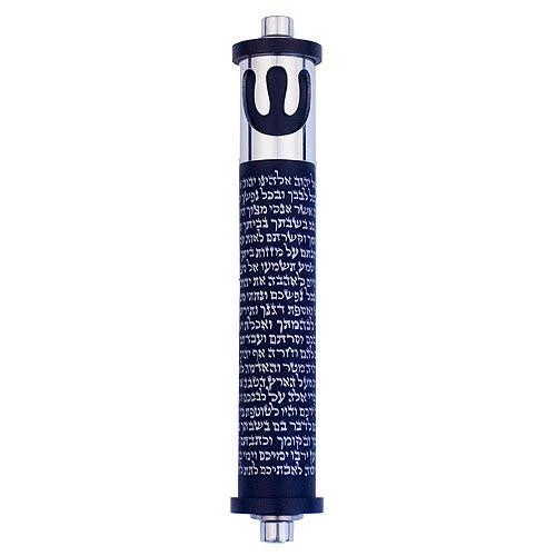 SHEMA WITH SHIN SERIES – CYLINDER. A large modern SHIN symbol dominates this design, and sits atop the SHEMA prayer that is engraved around the cylinder. This mezuzah case combines a contemporary look with a traditional sense of sacredness. We are reminded that inside the protective case, the parchment carries the words: And you shall love the Lord your God with all your heart, and all your soul, and all your might plus “And you shall inscribe these words upon the doorposts of your house and upon your gates.”