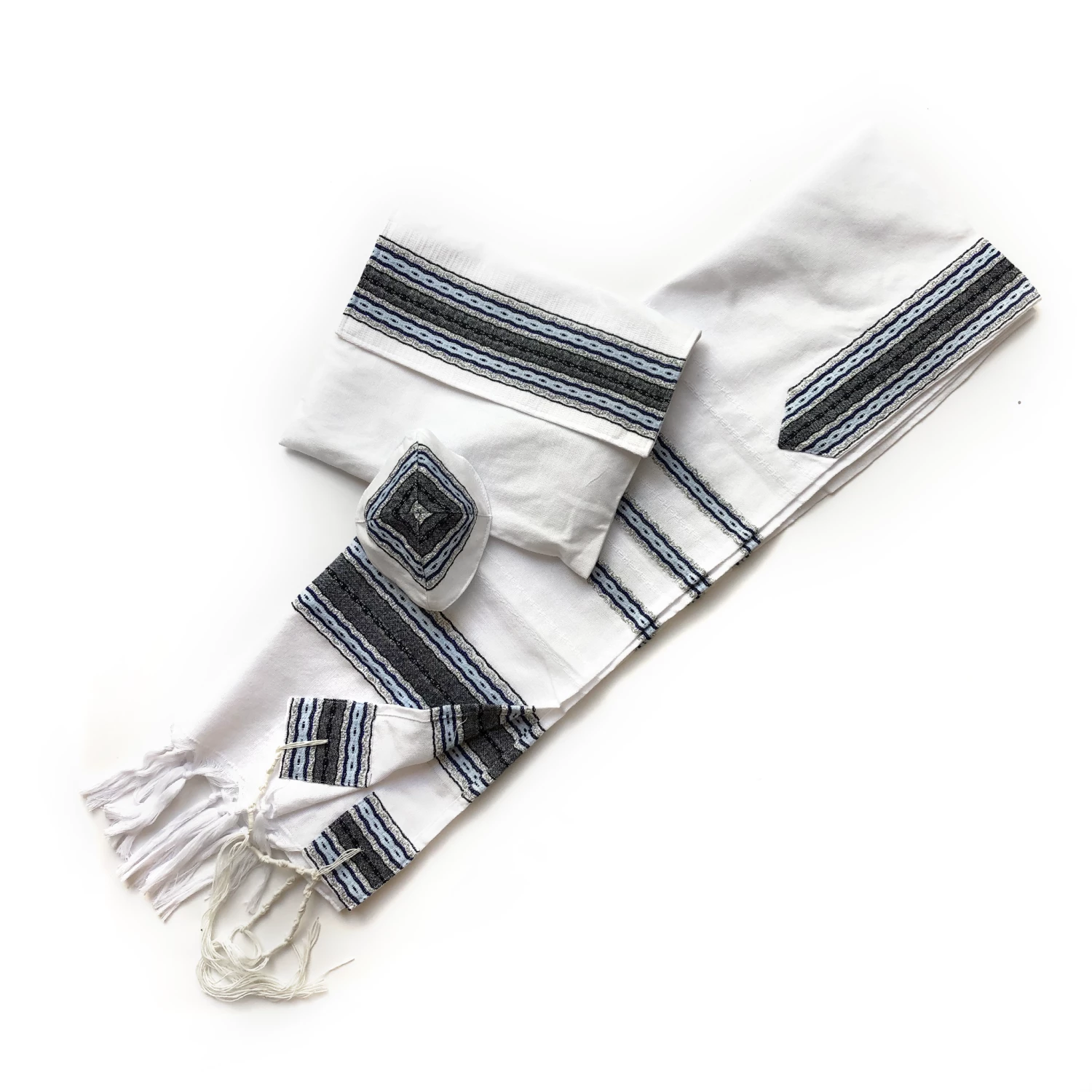 Gabrieli tallits are hand woven in our studio in Israel by our experienced tapestry artisans. We use the finest materials to ensure a finished product of the highest standard. All Gabrieli tallits are sold as a set that includes a matching kippah and tallit bag along with the tallit itself.