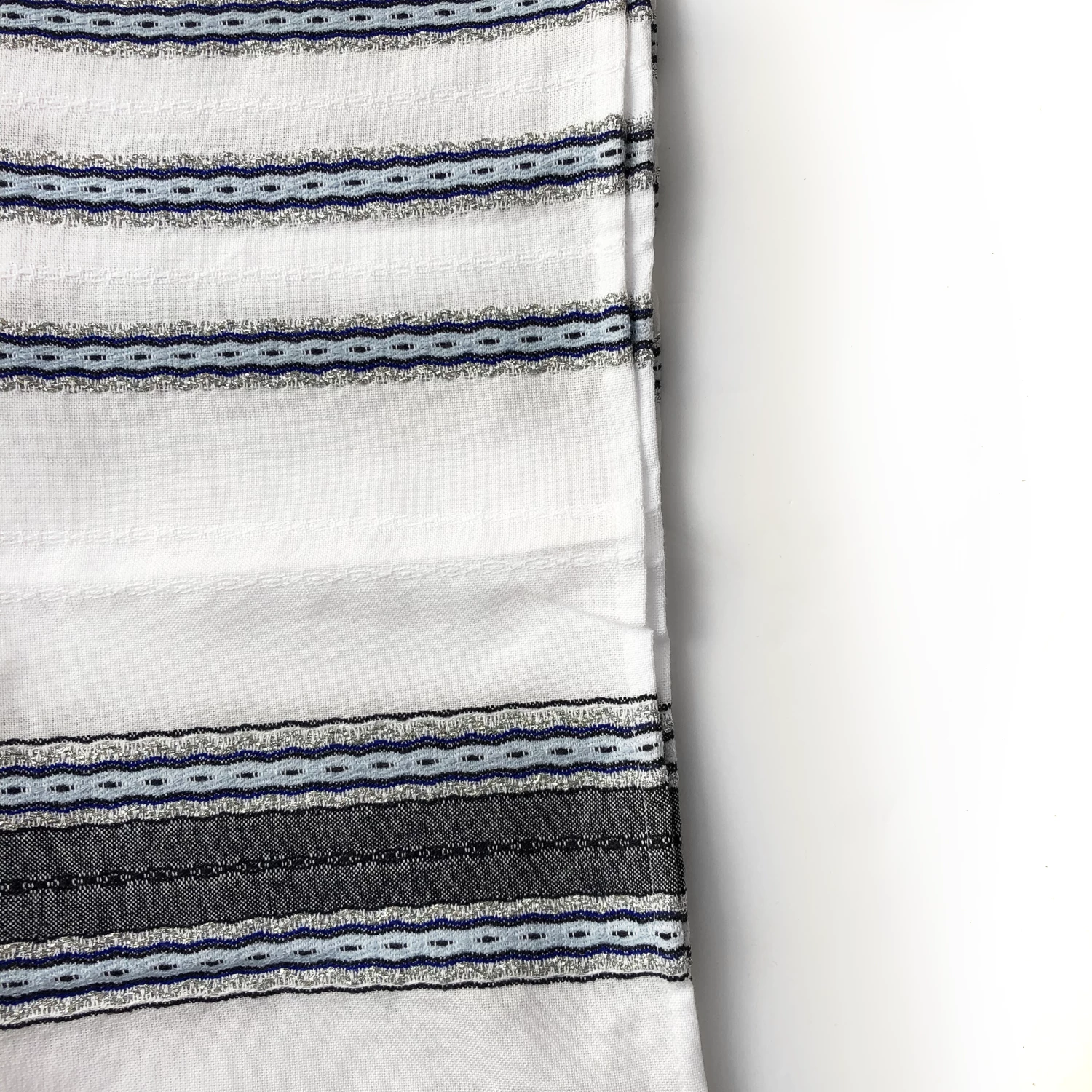 While ordering, choose to further customize your tallit by adding an atara, collar, with a hand embroidered blessing for donning the tallit and/or tzizit that include Ptil Tekhelet, blue strands.