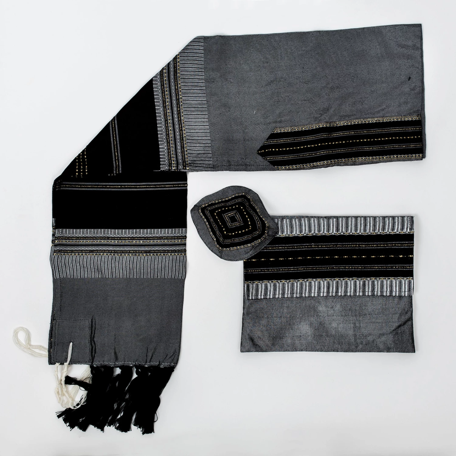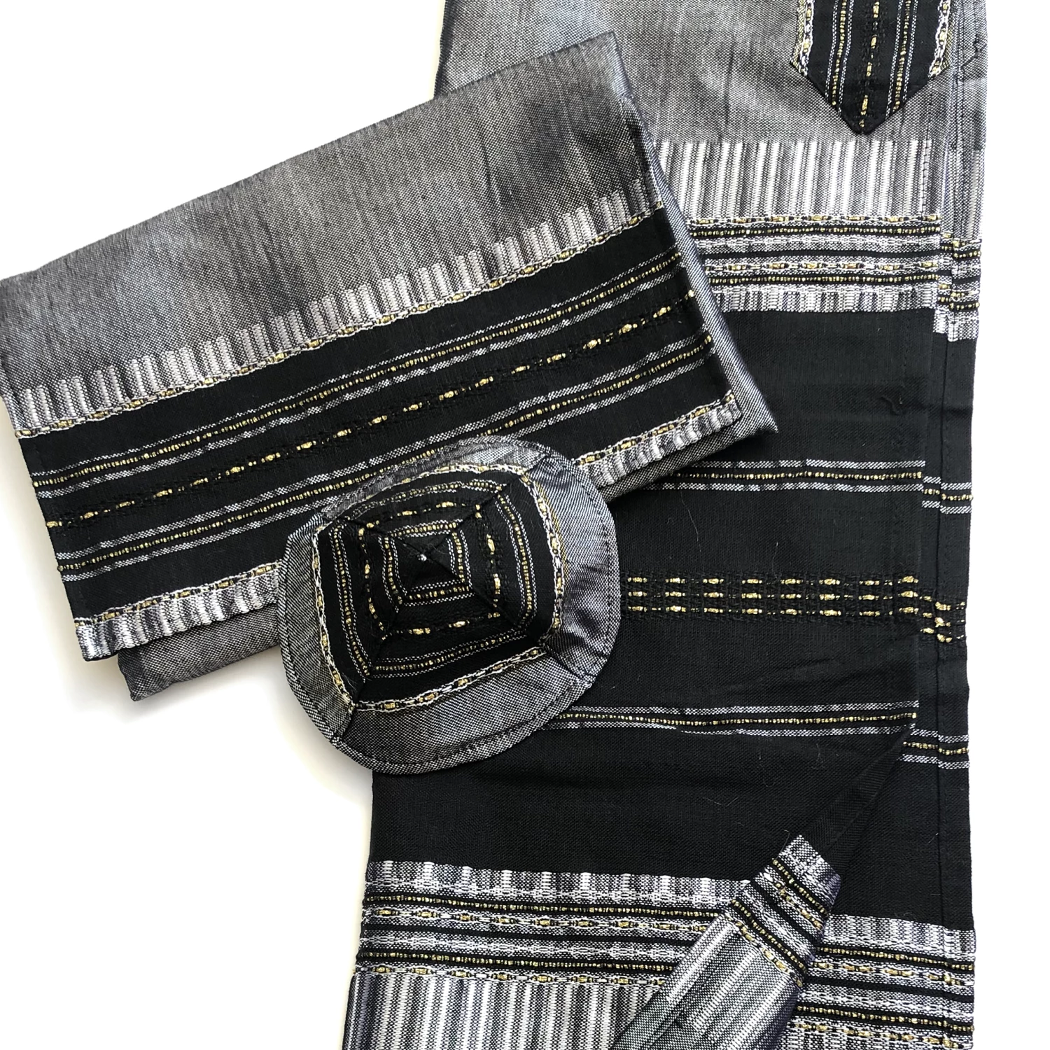 Gabrieli tallits are hand woven in our studio in Israel by our experienced tapestry artisans. We use the finest materials to ensure a finished product of the highest standard. All Gabrieli tallits are sold as a set that includes a matching kippah and tallit bag along with the tallit itself.