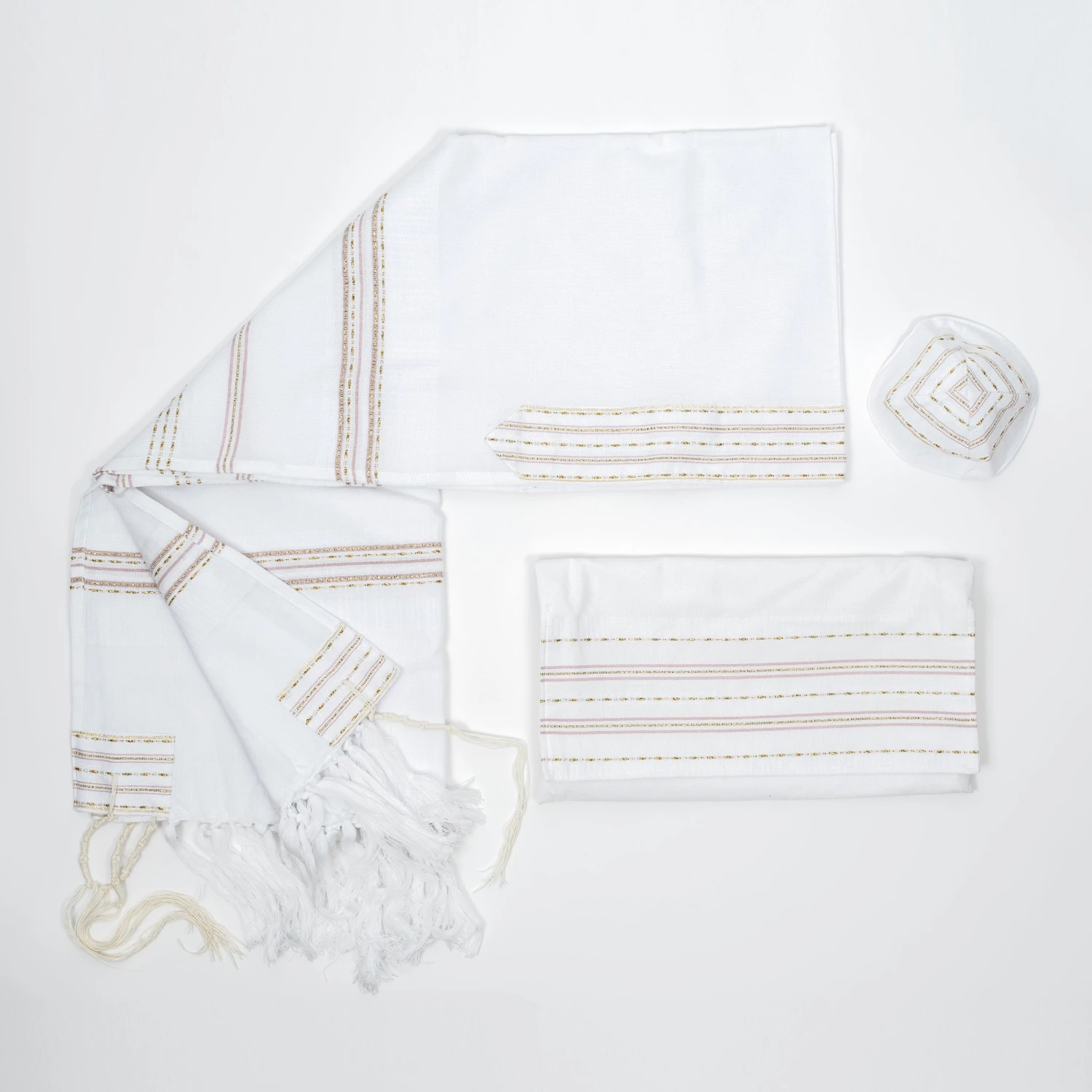 Gabrieli tallits are hand woven in our studio in Israel by our experienced tapestry artisans. We use the finest materials to ensure a finished product of the highest standard. All Gabrieli tallits are sold as a set that includes a matching kippah and tallit bag along with the tallit itself.