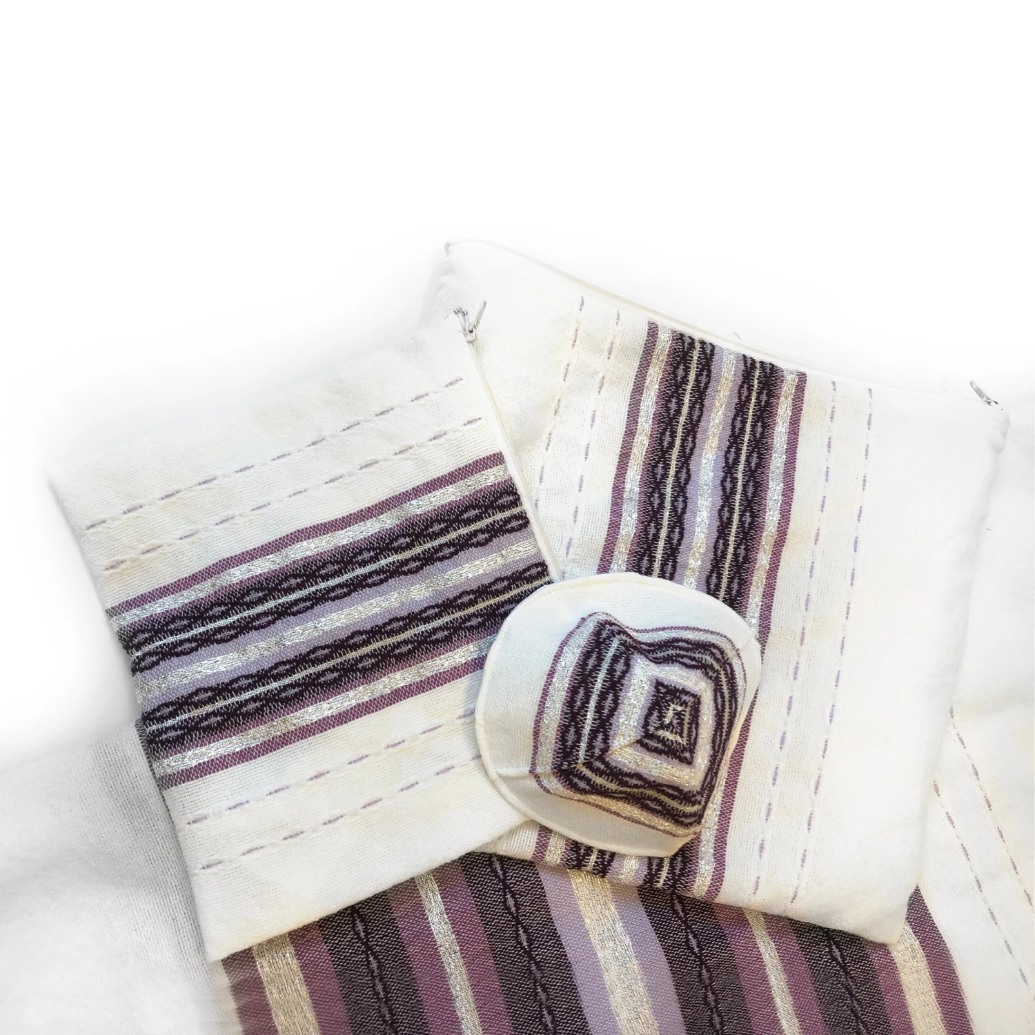 Hand woven in our studio in Israel by our experienced tapestry artisans, our Premium Collection consists of tallits with more intricate designs and patterns making each tallit a premium work of art. Each premium tallit comes standard with a hand embroidered blessing on the collar, double sided patterned corners, thick tzizit and a matching tefillin bag. As with all of our Gabrieli sets, the premium collection also includes a matching kippah and tallit bag.