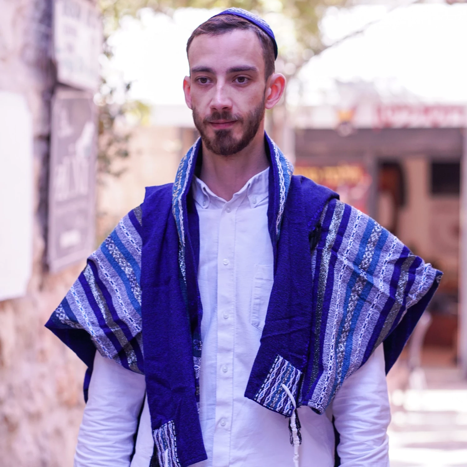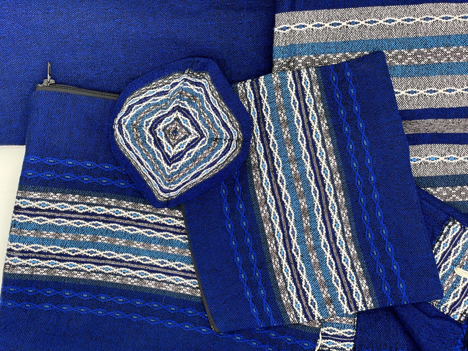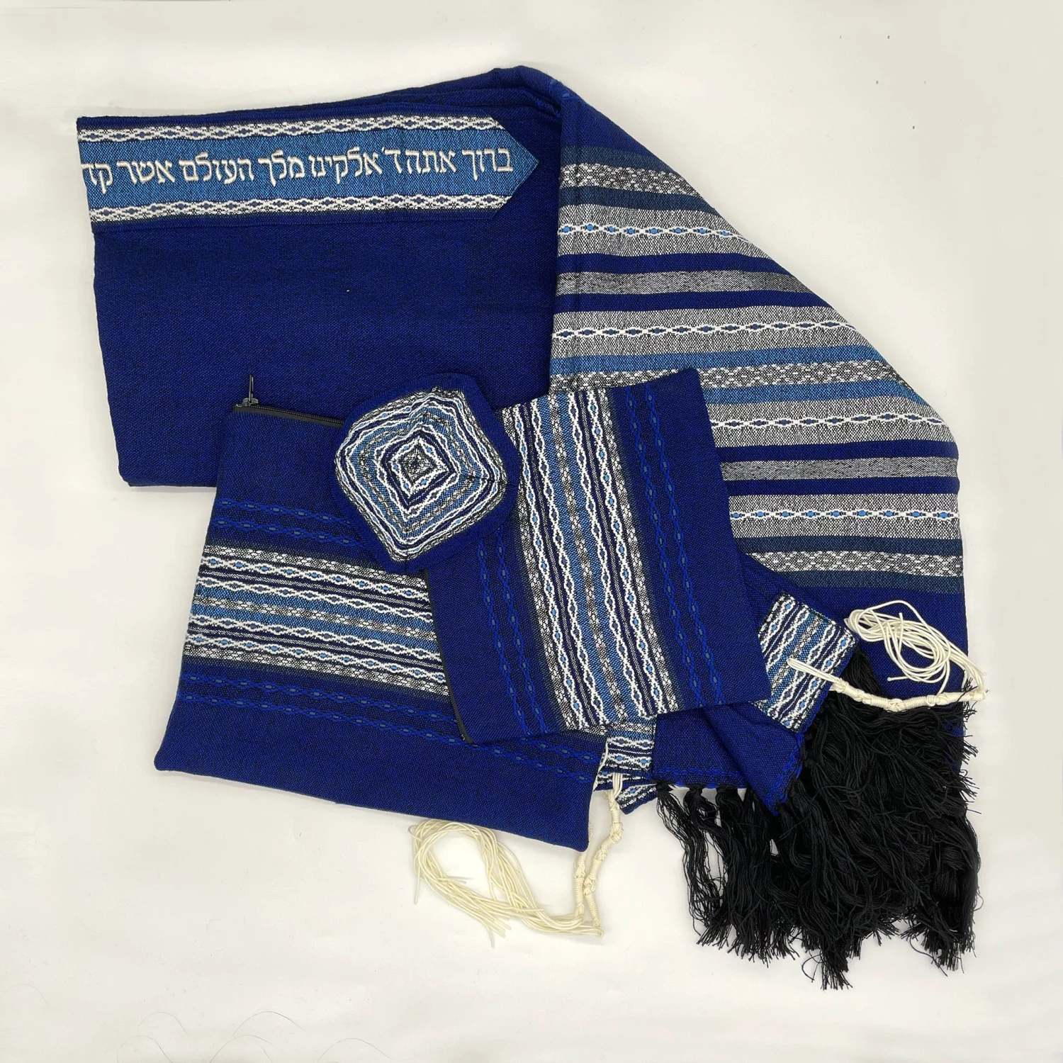 Hand woven in our studio in Israel by our experienced tapestry artisans, our Premium Collection consists of tallits with more intricate designs and patterns making each tallit a premium work of art. Each premium tallit comes standard with a hand embroidered blessing on the collar, double sided patterned corners, thick tzizit and a matching tefillin bag. As with all of our Gabrieli sets, the premium collection also includes a matching kippah and tallit bag.