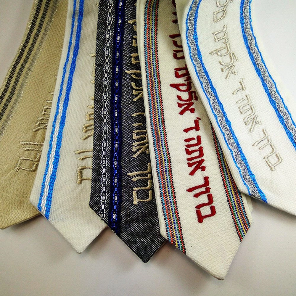 While ordering, choose to further customize your tallit by adding an atara, collar, with a hand embroidered blessing for donning the tallit and/or tzizit that include Ptil Tekhelet, blue strands.