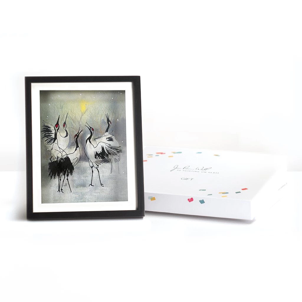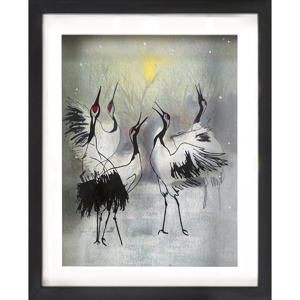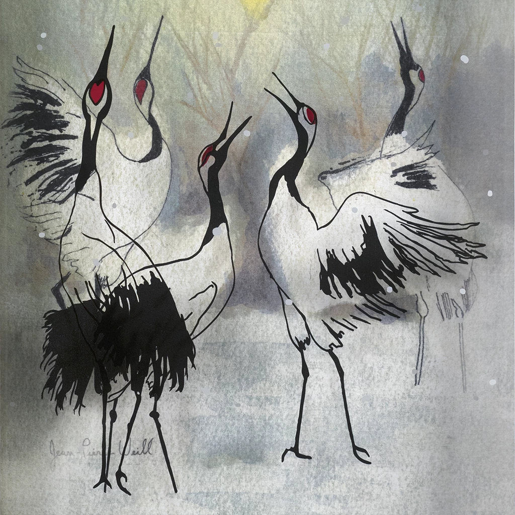 In the silence of snowfall, five cranes dip and raise their beaks in dance. These elegant creatures, said to live for a thousand years, are a symbol of happiness, eternal youth, and good fortune. The pleasure they feel is apparent in the grace of their movement beneath the soft caress of falling snow.