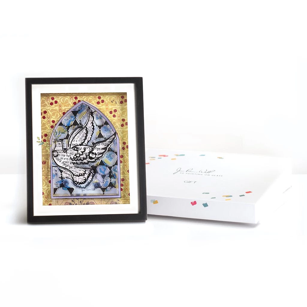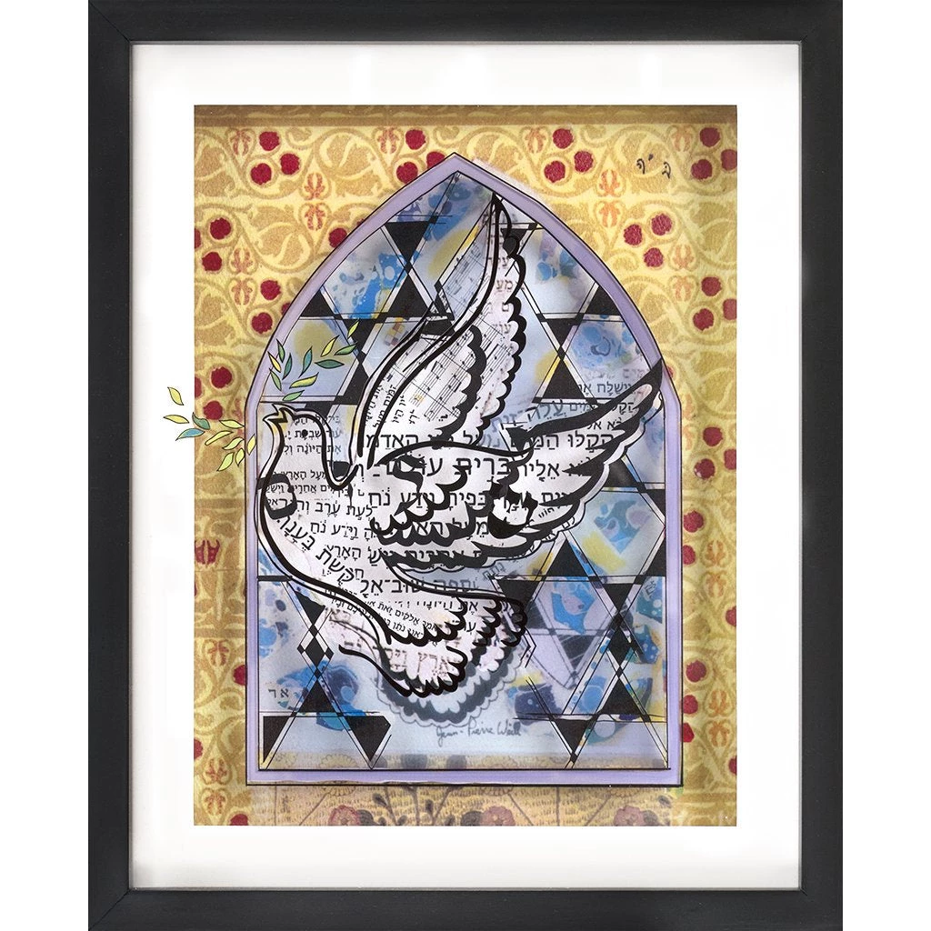 A dove holding an olive branch tightly in its beak flutters here in 3 dimensions. In the background is text from the Biblical story of Noah’s Ark and the promise for a more peaceful future. Â